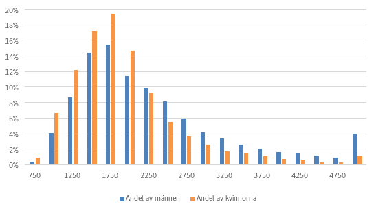 Figur 1: Fördelningen av de löner som låg till grund för inkomstrelaterad dagpenning 2022 enligt kön. Källa: Finansinspektionen