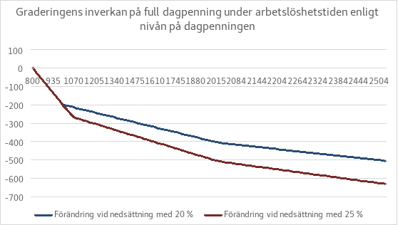 Enligt förslaget graderas nivån på den inkomstrelaterade dagpenningen så att den inkomstrelaterade dagpenningen sjunker om arbetslösheten drar ut på tiden. Den inkomstrelaterade dagpenningen minskar första gången när arbetslöshetsdagpenning har betalats för 40 arbetslöshetsdagar och andra gången när den har betalats för 170 arbetslöshetsdagar. Vid den första gränsen sjunker den inkomstrelaterade dagpenningen med 20 procent och vid den andra gränsen med 25 procent i förhållande till den inkomstrelaterade dagpenning som baserar sig på den lön som tjänats in under den tid som hänför sig till arbetsvillkoret och som ligger till grund för den inkomstrelaterade dagpenningen. Nedskärningen av den inkomstrelaterade dagpenningen ska alltså inte ske kumulativt.