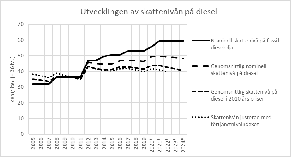 I likhet med andra flytande bränslen säljs dieselolja som blandningar, som utöver eller i stället för den fossila andelen innehåller lindrigare än den beskattade biobaserade komponenter. Dessutom har skatten på paraffiniska komponenter sänkts. Av figur 1 framgår det att till följd av att andelen bränslen som beskattas lindrigare har ökat har den genomsnittliga skattenivån på diesel inte ens nominellt förändrats i betydande grad sedan 2012, med undantag för en liten ökning från och med augusti 2020. Om förändringen i den allmänna prisnivån beaktas, har den genomsnittliga skattenivån på diesel under de senaste åren varit lägre än 2012 års nivå trots skatteförhöjningarna. När man utöver dessa beaktar att ingen justering av nivån på drivkraftsskatten har gjorts efter 2012, kan det konstateras att beskattningen av både dieseldrivna personbilar och lastbilar som helhet även för närvarande är reellt lindrigare än 2012. Skillnaden jämfört med den tidigare är inte betydande, eftersom användarna av personbilar i genomsnitt till fullt belopp kompenserades för höjningen av den literbaserade skatten 2012 genom en sänkning av drivkraftsskatten med 7,9 cent, medan lastbilar omfattades av sänkt drivkraftsskatt och slopad FPA-avgift för arbetsgivarna.