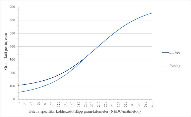 Sedan 2016 har fordonsskattens grundskattebelopp varit 106,21 euro per år om koldioxidutsläppet är 0 gram per kilometer och 654,44 euro per år om utsläppet är 400 gram eller mera. Grundskattebeloppet för elbilar är den lägsta skatten i skattetabellen, dvs. 106,21 euro per år. I intervallet mellan den högsta och den lägsta skatten har skatten bestämts separat för varje gram koldioxid så att skatten stiger i takt med att koldioxidutsläppen ökar. Den grundskatt som baserar sig på totalmassan är 222,65 euro vid tabellens nedre gräns, dvs. när fordonets totalmassa är högst 1 300 kilogram, och 632,18 euro vid tabellens övre gräns, när totalmassan är 3 401 kilogram eller mera. Den skatt som baserar sig på totalmassan är angiven per hundra kilogram, och den dimensionerades ursprungligen så att den är något lindrigare än den skatt som baserar sig på de faktiska koldioxidutsläppen för ett motsvarande fordon.