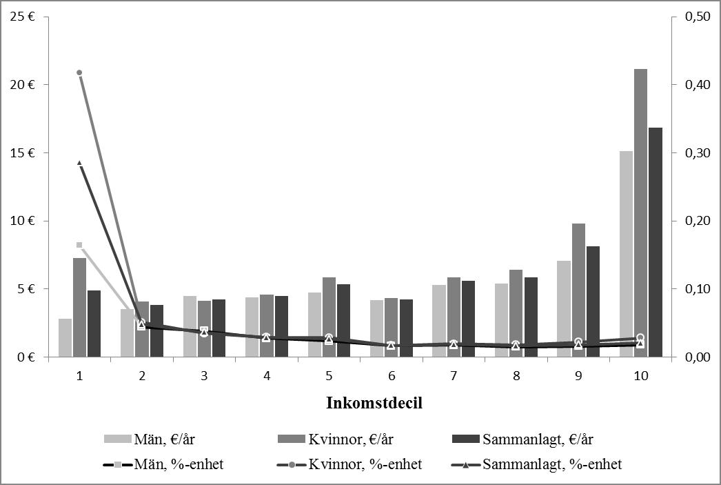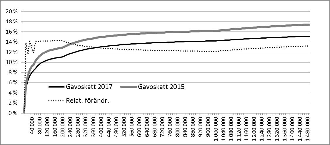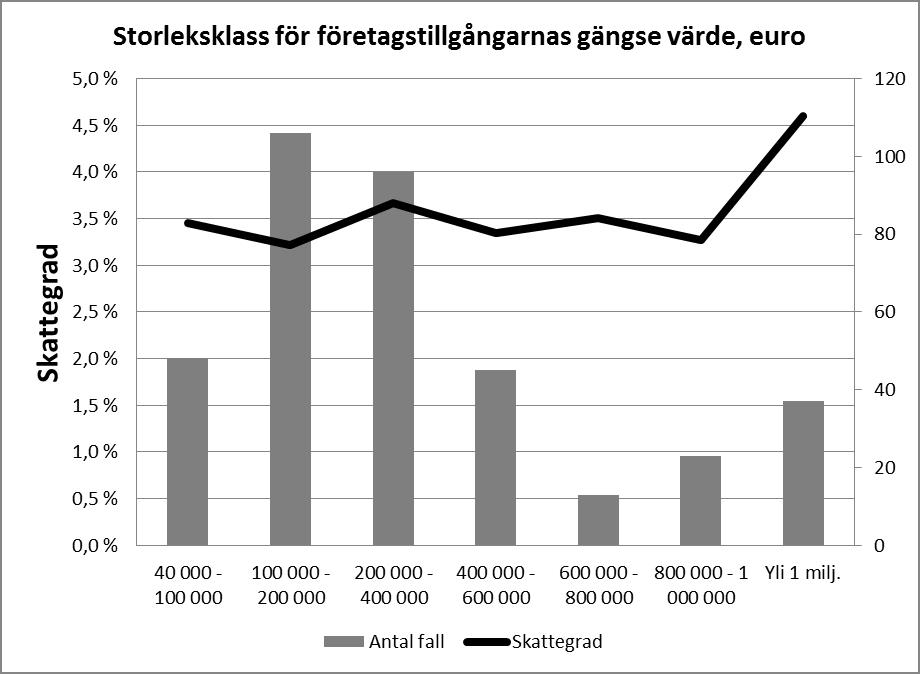Av figuren nedan framgår antalet beslut om skattelättnader som gällde de ovannämnda 400 andra företag än gårdsbruksenheter (den högra lodräta axeln) och den effektiva skattegraden (den vänstra lodräta axeln) klassificerade enligt gåvans värde. Gåvans värde utgörs av de överlåtna företagstillgångarnas värde efter t.ex. avdrag för besittningsrätten.