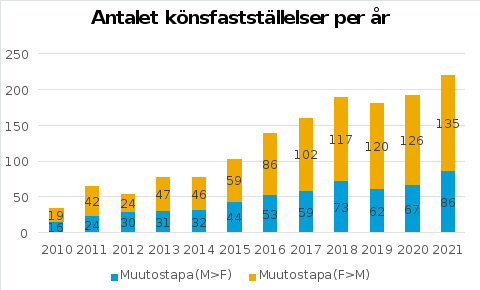 År 2021 var den genomsnittliga behandlingstiden för en ansökan om fastställande av könstillhörighet tio dagar vid Myndigheten för digitalisering och befolkningsdata. För närmare 70 procent av ansökningarna var behandlingstiden dock en vecka eller kortare. Behandlingstiden var längre om ansökan eller uppgifterna om sökanden måste kompletteras.