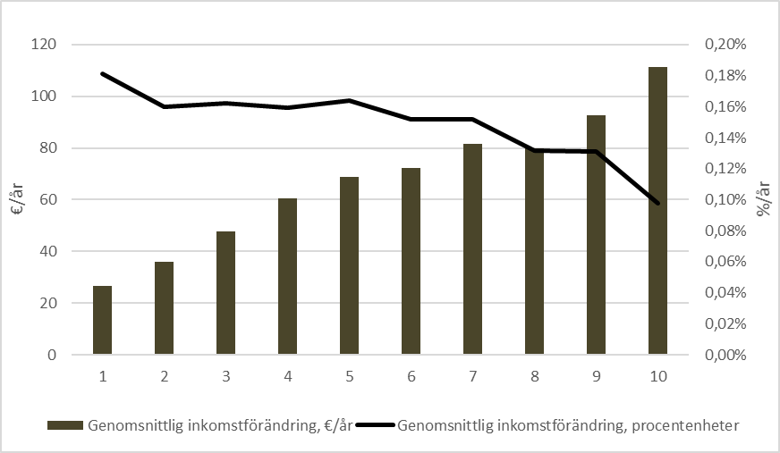 I förhållande till inkomsterna minskar en sänkning av mervärdesskatten på elenergi mest skattebördan för låginkomsttagare, men räknat i absoluta eurobelopp drar de som har stora inkomster större nytta av sänkningen. I kalkylen antas det att hushållens avtalspriser fördelar sig jämnt på de olika inkomstklasserna.
