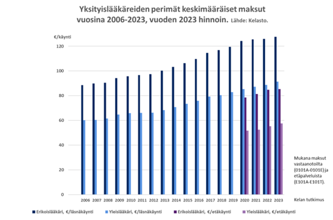 Av privatläkare uttagna arvoden i medeltal 2006–2023. Källa: FPA:s forskning. Texten i bilden lyder på svenska: Yksityislääkäreiden perimät keskimääräiset maksut vuosina 2006–2023, vuoden 2023 hinnoin. Lähde: Kelasto = Av privatläkare uttagna avgifter i medeltal 2006–2023, i 2023 års priser. Källa: Kelasto, €/käynti = €/besök, Mukana maksut vastaanotoilta (0101A–0101E) ja etäpalveluista (E101A–E101T) = Inkluderar avgifter för mottagningar (0101A–0101E) och för distanstjänster (E101A–E101T), Kelan tutkimus = FPA:s forskning, Erikoislääkäri, €/läsnäkäynti = Specialistläkare, €/fysiskt besök, Yleislääkäri, €/läsnäkäynti = Allmänläkare €/fysiskt besök, Erikoislääkäri, €/etäkäynti = Specialistläkare, €/distansbesök, Yleislääkäri €/etäkäynti = Allmänläkare, €/distansbesök.