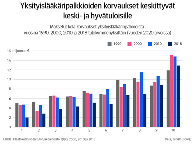 Fördelningen av privatläkararvoden enligt inkomstklass 1990, 2000, 2010 och 2018. Källa: FPA:s forskningsblogg. Texten i bilden lyder på svenska: Yksityislääkäripalkkioiden korvaukset keskittyvät keski- ja hyvätuloisille = Ersättningarna för privatläkararvoden koncentreras till medel- och höginkomsttagare, Maksetut Kela-korvaukset yksityislääjärinpalkkioista vuosina 1990, 2000, 2010 ja 2018 (vuoden 2020 arvoissa) = Utbetalda FPA-ersättningar för privatläkararvoden 1990, 2000, 2010 och 2018 enligt inkomstdecil (i 2020 års värden), 16 miljoonaa € = 16 miljoner €, Lähde: Tilastokeskuksen tulonjakoaineisto 1990, 2000, 2010 ja 2018 = 2018 Källa: Statistikcentralens inkomstfördelningsmaterial 1990, 2000, 2010 och 2018, Kela, tutkimusblogi = FPA, Forskningsblogg.