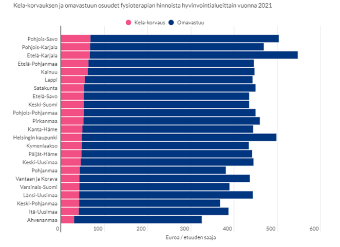 FPA-ersättningens och självriskens andelar av fysioterapipriserna enligt välfärdsområde 2021. Texten i bilden lyder på svenska: Kela-korvauksen ja omavastuun osuudet fysioterapian hinnoista hyvinvointialueittain vuonna 2021 = FPA-ersättningens och självriskens andelar av fysioterapipriserna enligt välfärdsområde 2021, Kela-korvaus = FPA-ersättning, Omavastuu = Självrisk, Pohjois-Savo = Norra Savolax, Pohjois-Karjala = Norra Karelen, Etelä-Karjala = Södra Karelen, Etelä-Pohjanmaa = Södra Österbotten, Kainuu = Kajanaland, Lappi = Lappland, Satakunta = Satakunta, Etelä-Savo = Södra Savolax, Keski-Suomi = Mellersta Finland, Pohjois-Pohjanmaa = Norra Österbotten, Pirkanmaa = Birkaland, Kanta-Häme = Egentliga Tavastland, Helsingin kaupunki = Helsingfors stad, Kymenlaakso = Kymmenedalen, Päijät-Häme = Päijänne-Tavastland, Keski-Uusimaa = Mellersta Nyland, Pohjanmaa = Österbotten, Vantaa ja Kerava = Vanda och Kervo, Varsinais-Suomi = Egentliga Finland, Länsi-Uusimaa = Västra Nyland, Keski-Pohjanmaa = Mellersta Österbotten, Itä-Uusimaa = Östra Nyland, Ahvenanmaa = Åland, Euroa/etuuden saaja = Euro/förmånstagare.