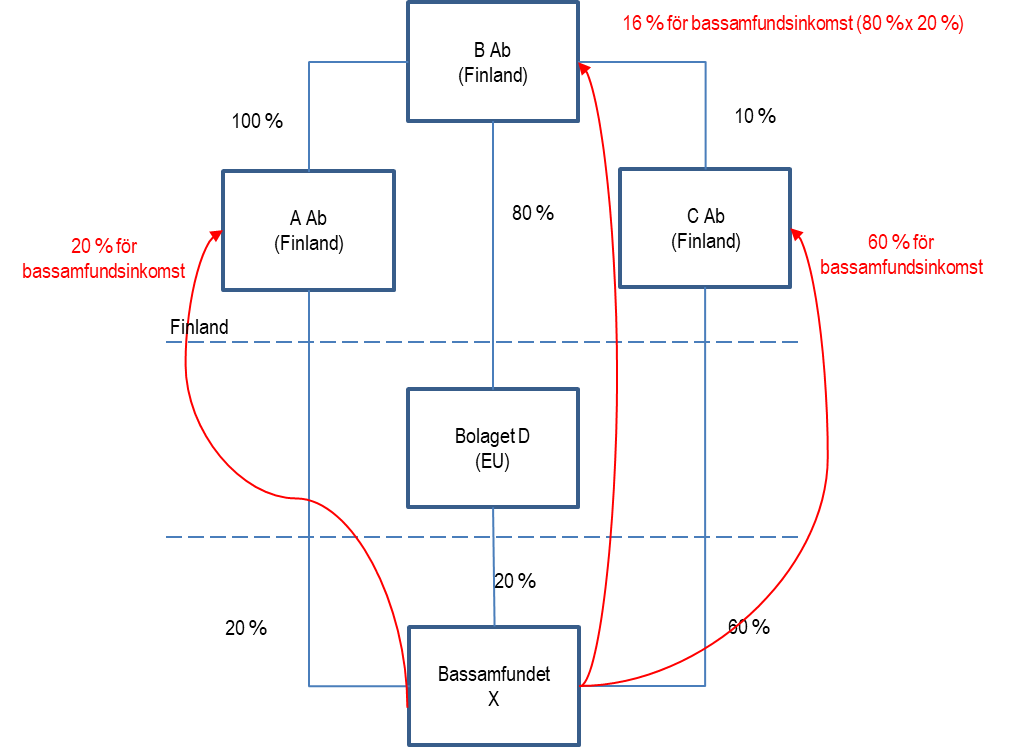 En sådan delägare i ett utländskt bassamfund som är allmänt skattskyldig i Finland är här skyldig att betala skatt på sin andel av bassamfundets inkomst. Delägaren är skattskyldig, om den äger minst 25 procent av samfundets kapital eller är berättigad till en andel på minst 25 procent av avkastningen av samfundets kapital. Vid beskattningen av bassamfundsinkomst ska även sådana eventuella bestämmelser i skatteavtal beaktas som kan begränsa beskattningen av bassamfundsinkomsten.