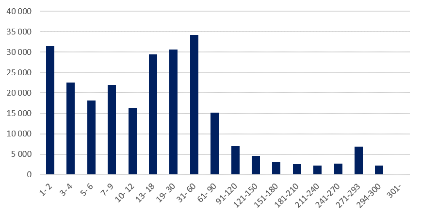 I bedömningen har utnyttjats Folkpensionsanstaltens (Fpa) statistik om antalet sjukfrånvarofall. Där har beaktats alla till Fpa anmälda sjukfrånvaroperioder som varat över nio dagar och som börjat under 2016. Bedömningen utgår från att den kortaste möjliga längden på sådan sjukledighet i fråga om vilken den föreslagna bestämmelsen kan ha inverkan på semestervolymen är 82 arbetsdagar, dvs. cirka 98 vardagar. Det nämnda antalet 82 arbetsdagar utgörs av att sju dagar adderas till 75 dagar. En månad kan som minst omfatta 20 arbetsdagar och då innebär sju sjukdagar att en full kvalifikationsmånad inte tjänas in. Med beaktande av Fpa:s statistikföringssätt börjar den föreslagna bestämmelsens verkningar i praktiken synas i grupperna av sjukledighetsperioder som varat 91—120 dagar eller längre än så (se diagrammet nedan). Den mest betydande effekten på intjänandet av semester syns dock först vid mycket långa sjukledigheter.