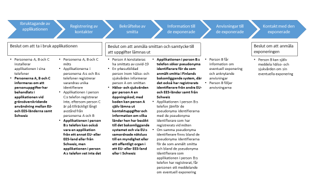 Om någon som använder den finländska applikationen, Coronablinkern, konstateras vara smittad med covid-19 och matar in den öppningskod i applikationen som han eller hon fått från hälso- och sjukvården, sänds pseudonyma identifierare till det bakomliggande systemet i Finland. Det bakomliggande systemet registrerar den smittade personens pseudonyma identifierare och för en förteckning över pseudonyma identifierare för alla som anmält att de är smittade. När andra personers mobilapplikationer kontaktar det bakomliggande systemet sänder systemet de pseudonyma identifierarna för alla som anmält smitta till applikationen i samtliga användares telefoner. Applikationen jämför de pseudonyma identifierarna för de som anmält smitta med de pseudonyma identifierare som sparats i telefonen vid möten med mobilapplikationer och bedömer utifrån en jämförelse om exponering eventuellt har skett eller inte. Om en eventuell exponering har skett, ska applikationen underrätta personen och ge honom eller henne råd.