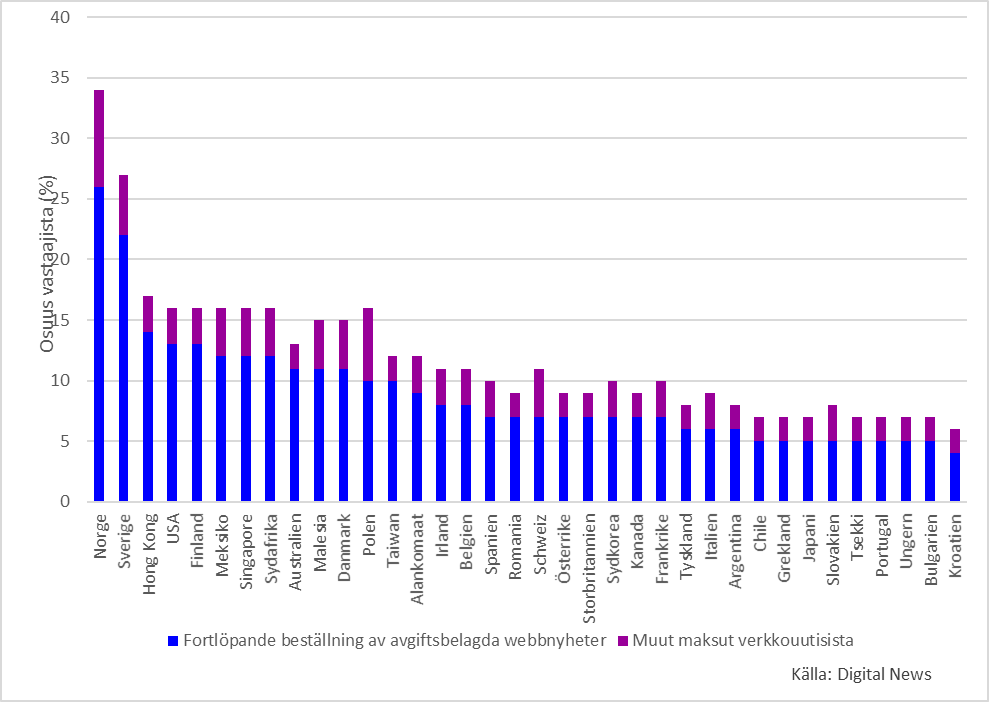 Enligt Digital News Reports landsrapport för Finland betalar en ganska liten del av befolkningen för webbnyheter. Av de finländare som svarade på enkäten uppgav 16 procent att de betalat för webbnyheter under det år som föregick enkäten. Andelen har förblivit relativt konstant under de senaste åren, även om allt fler finländska tidningar samtidigt har tagit i bruk så kallade betalväggar. Av dem som betalat för webbnyheter har 39 procent gjort en fortlöpande prenumeration på digitala nyhetstjänster. Engångsavgifter för en enskild artikel eller publikation hade under det år som föregick enkäten betalats av 12 procent av dem som svarade. Det är vanligare att unga och höginkomsttagare betalar för webbnyheter. Reunanen (2019).