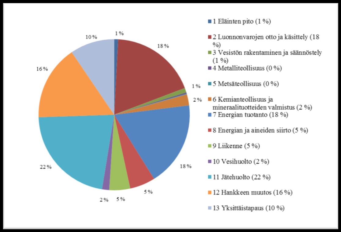 Bedömningsförfarandet tillämpas enligt 4 § på projekt som kan ha betydande skadliga miljökonsekvenser. Genom förordning av statsrådet föreskrivs om vissa typer av projekt som alltid ska genomgå miljökonsekvensebedömning. Projektförteckningen i förordningens 6 § innehåller 50 typer av projekt grupperade i 11 sektorer. Förfarandet tillämpas inom följande sektorer: 1) djurhållning, 2) tagande och bearbetning av naturtillgångar, 3) byggande i vattendrag och vattenreglering, 4) metallindustri, 5) skogsindustri, 6) kemisk industri och produktion av mineralprodukter, 7) energiproduktion, 8) överföring och lagring av energi och substanser, 9) trafik, 10) vatten och avlopp, 11) avfallshantering samt 12) ändringar av projekt, om ändringarna till storleken motsvarar de projekt som avses i 1-11 punkten. Projektförteckningen i förordningen är uttömmande.