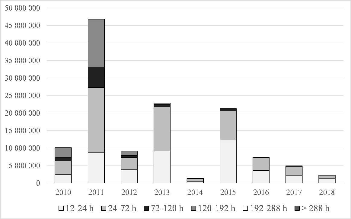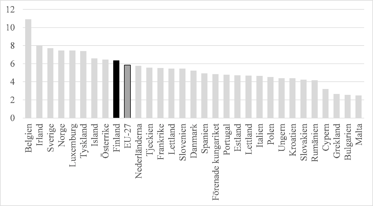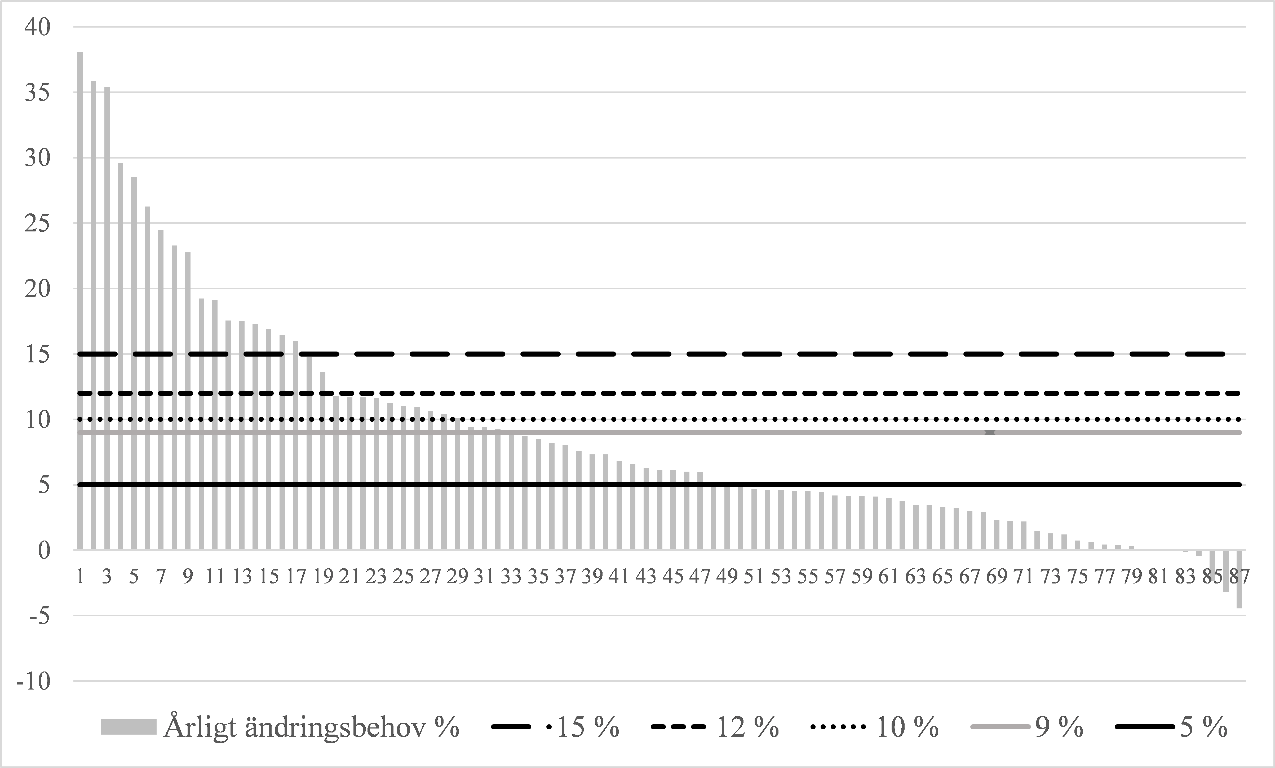 I diagram 7 nedan presenteras behovet av att höja nätinnehavarnas omsättning för att de i enlighet med grundlagsutskottets utlåtande ska kunna samla in den tillåtna avkastningen enligt metoderna för beräkning av tariffer som Energimyndigheten fastställt också i fråga om underskottet under den föregående perioden. Omsättningen har beräknats i diagrammet utan skatt, eftersom Energimyndigheten inte har uppgifter om fördelningen av den mäng energi som distributionsnätsinnehavarna överfört till sina kundgrupper. Skatternas effekt på värdena för den övre gränsen för den maximala höjningen har därför inte kunnat beaktas i kalkylen. Eftersom den maximala höjningen beräknas utifrån de skattepliktiga överförings- och distributionsavgifterna för varje kundgrupp, är distributionsnätsinnehavarnas möjligheter att höja priset de facto högre jämfört med de referensvärden som använts i diagrammet. I exempelvis sådana kundgrupper där det finns konsumentkunder innebär en maximal höjning på 15 procent en möjlighet att höja distributionsnätsinnehavarens andel av distributionsfakturan med ca 24 procent, och i sådana kundgrupper där det finns industrikunder en möjlighet att höja distributionsnätsinnehavarens andel av distributionsfakturan med ca 22 procent. I diagrammet har det antagits att bolagen ska samla in det underskott som har uppkommit under den tillsynsperiod som avslutades 2019 under de två följande tillsynsperioderna åren 2020–2027 med stöd av undantagstillstånd av Energimyndigheten. På basis av diagrammet ser man att redan den nuvarande höjningsgränsen på 15 procent, dvs. en höjning av distributionspriset med ca 22–24 procent, minskar möjligheten för ca 10 nätinnehavare att samla in det underskott som ackumulerats under den tillsynsperiod som avslutades 2019 under de två följande perioderna. Ju lägre gränsen sänks, desto fler nätinnehavare kommer gränsen att påverka.