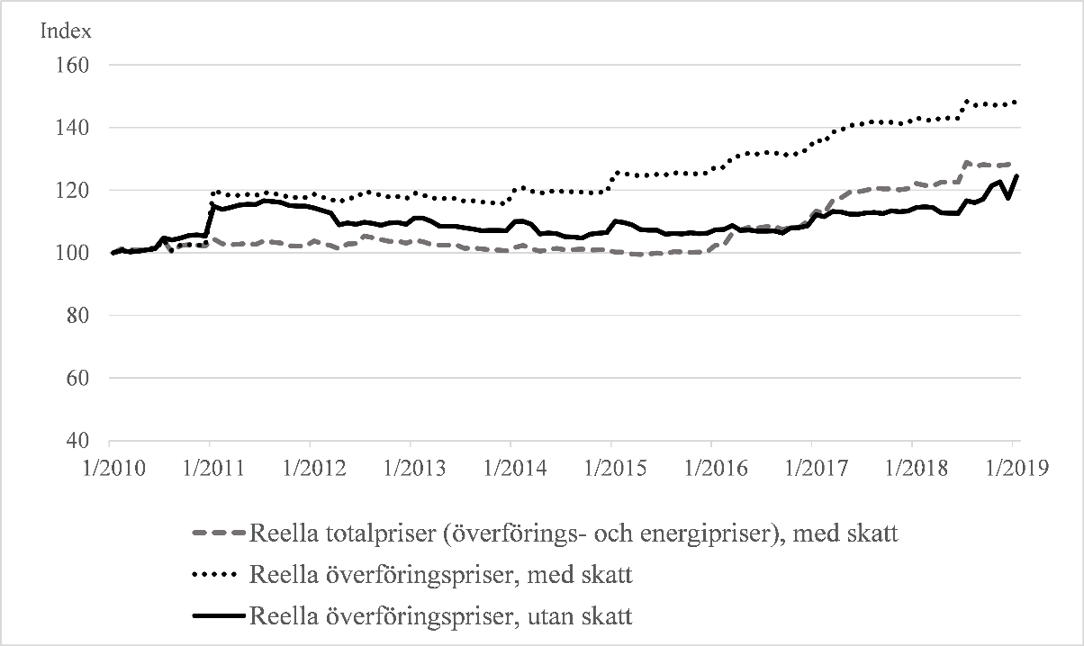 År 2017 fastställdes det att den årliga maximala höjningen av elöverförings- och distributionsavgifterna ska vara 15 procent. Som övre gräns för den maximala höjningen valdes den gräns på 15 procent som blivit etablerad i tillämpningspraxisen för konsumentskyddslagstiftningen och lagstiftningen om hyra av bostadslägenheter. Den maximala godtagbara höjningen beräknas utifrån den genomsnittliga totalavgift som nätinnehavaren tar ut av varje kundgrupp som representerar användarna av elnätet under en granskningsperiod på tolv månader. Den maximala godtagbara höjningen beräknas i varje kundgrupp på det skattepliktiga pris för elöverföring och eldistribution som fastställts enligt den högsta skattesats som tillämpas på de nätanvändare som ingår i respektive kundgrupp. Enligt regeringens proposition RP 50/2017 rd baserar sig användningen av priset inklusive skatt som beräkningsgrund på att även den bedömning av oskälighet hos ett avtalsvillkor som avses i 4 kap. 1 § i konsumentskyddslagen görs på basis av priser inklusive skatt.