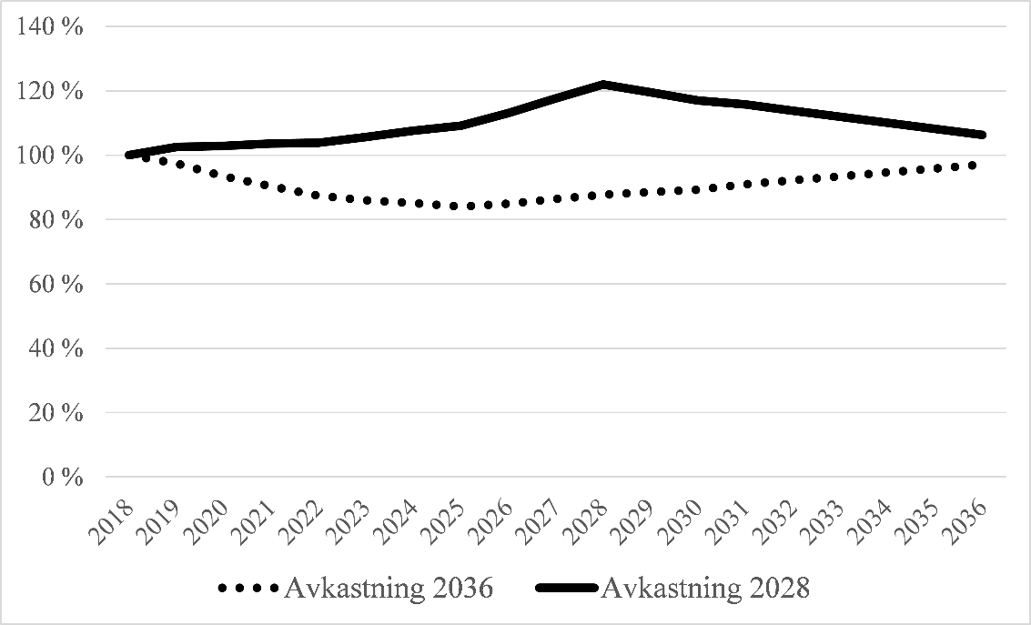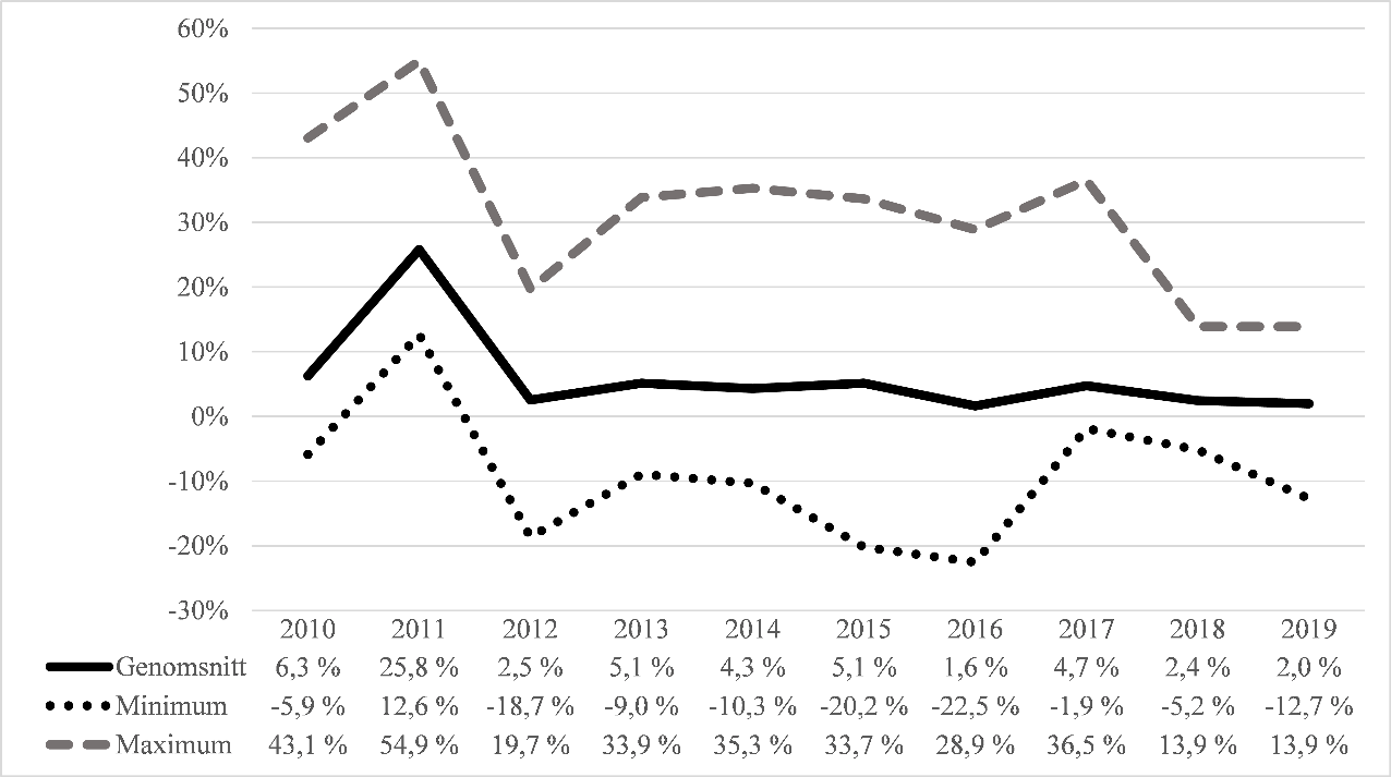 Diagram 7. Nätinnehavarnas årliga behov att ändra omsättningen i procent i ett läge där de samlar in tidigare ackumulerat underskott från sina kunder under de två följande perioderna (2020–2027). Källa: Energimyndigheten