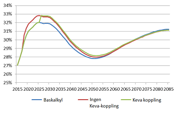 Om yrkeshögskolorna är kopplade till Kevas medlemssamfund innebär det för dessa samfund att pensionsutgifterna i förhållande till lönesumman följer baskalkylen till utgången av 2025 (figur 1). Det betyder att ägararrangemangen inte får några konsekvenser för Kevas inkomst- och utgiftsstruktur jämfört med nuläget. Efter det överförs yrkeshögskolornas försäkringar och avgifterna i anslutning till dem enligt antagandet till tillämpningsområdet för ArPL, varvid Kevas pensionsutgifter i förhållande till lönesumman ökar tydligt. Däremot tjänas inga pensioner från yrkeshögskolorna längre in hos Keva, och småningom återgår pensionsutgiften i förhållande till lönesumman till basnivån. Yrkeshögskolornas koppling till Keva-systemet medför således fram till 2025 lättnader i fråga om medlemssamfundens betalningsandelar. Härefter leder arrangemanget till en långvarig men ringa ökning av betalningsandelarna för Kevas medlemssamfund, jämfört med scenariot där yrkeshögskolornas koppling till Keva upphör redan tidigare. Det bör observeras att kalkylen vad skalan beträffar inte motsvarar de faktiska konsekvenserna av förslaget. Åtminstone kommer inte alla yrkeshögskolor att i enlighet med antagandena i kalkylen börja omfattas av ArPL den 1 januari 2018 eller ens efter den 31 december 2025. Det beror som sagt på att ägararrangemang pågår bara vid 4 av de 18 yrkeshögskolor som är medlemssamfund hos Keva och att det inte nödvändigtvis blir några arrangemang alls, om den föreslagna lagen inte stiftas. Den mest sannolika följden om propositionen inte förverkligas är att majoriteten av ägandet i yrkeshögskolor som är medlemssamfund i Keva kvarstår hos kommunala ägare och den strukturella reformen av högskolorna förhindras till denna del. Då fortsätter yrkeshögskolorna att vara medlemssamfund i Keva i enlighet med scenariot ”baskalkyl”. Kalkylen beskriver trots det väl mekanismen för konsekvenserna av propositionen. När det gäller yrkeshögskolornas pensioner kan propositionen väsentligen förändra penningströmmarnas riktning och deras tidsmässiga konsekvenser. Om alla de fyra yrkeshögskolor som för närvarande förbereder annat ägande än ägande med kommunmajoritet genomför sina projekt, motsvarar effekten cirka en femtedel av den beskrivna maximieffekten.