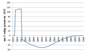 Figur 2 beskriver hur scenariot att yrkeshögskolorna är kopplade till Keva som dess medlemssamfund fram till 2025 (varefter de börjar omfattas av ArPL) påverkar Kevas kassaflöde jämfört med det scenario där alla yrkeshögskolor som för närvarande är medlemssamfund i Keva börjar omfattas av ArPL den 1 januari 2018. Kevas inkomster från avgifter är, på grund av yrkeshögskolornas Keva-koppling, fram till 2025 betydligt högre än utan denna koppling, så effekterna på kassaflödet är positiva ända fram till dess. År 2026 upphör emellertid inkomsterna från de avgifter som yrkeshögskolorna betalar och samtidigt ska de pensioner som har tjänats in under tiden för Keva-kopplingen småningom börja betalas ut, så då blir effekterna på kassaflödet negativa. Mot slutet av århundradet beräknas dessa pensioner vara betalda, och då påverkar Kela-kopplingen inte längre kassaflödet. Också här måste det beaktas att kalkylen avsevärt överdriver de faktiska konsekvenserna av detta förslag eftersom ägararrangemang pågår bara vid 4 av de 18 yrkeshögskolor som är medlemssamfund hos Keva och det inte nödvändigtvis blir några arrangemang alls, om den föreslagna lagen inte stiftas. Den mest sannolika följden om propositionen inte förverkligas är att majoriteten av ägandet i yrkeshögskolor som är medlemssamfund i Keva kvarstår hos kommunala ägare och den strukturella reformen av högskolorna förhindras till denna del. Kalkylen beskriver trots det väl mekanismen för konsekvenserna av propositionen. De faktiska konsekvenserna kan följa motsvarande tidsmässiga och relativa fördelning, och är betydligt mindre till omfattningen. Om alla de fyra yrkeshögskolor som för närvarande förbereder annat än ägande med kommunmajoritet förverkligar sina projekt, motsvarar effekten cirka en femtedel av den beskrivna maximieffekten.