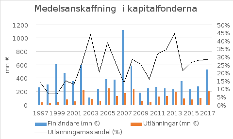 Nedan finns en beskrivning av de inhemska och utländska investerarnas andel av medelsanskaffningen i finländska kapitalfonder 1997—2016.