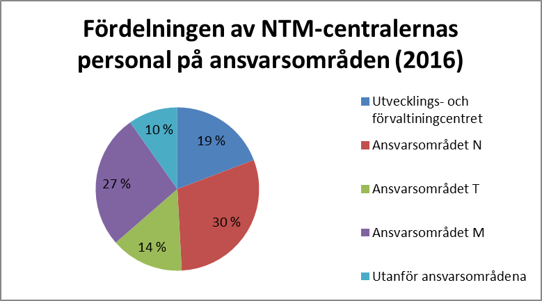 Baserat på utfallet för 2016 beräknas resurserna vid NTM-centralerna uppgå till sammanlagt 3 080 årsverken, inklusive 508 årsverken vid utvecklings- och förvaltningscentret. Personalmängden vid NTM-centralerna varierar mellan 44 och 308 årsverken. Personalresursen inom de 15 N-ansvarsområdena är sammanlagt 922 årsverken, inom de 13 M-ansvarsområdena 819 årsverken och inom de 9 T-ansvarsområdena 445 årsverken. Inom NTM-centralernas enheter som inte hör till något ansvarsområde finns resurser om 302 årsverken. Vid NTM-centralernas riksomfattande enheter (arbets- och näringsförvaltningens kundservicecenter, NTM-centralernas och arbets- och näringsbyråernas utvecklings- och förvaltningscenter) finns sammanlagt 592 årsverken.