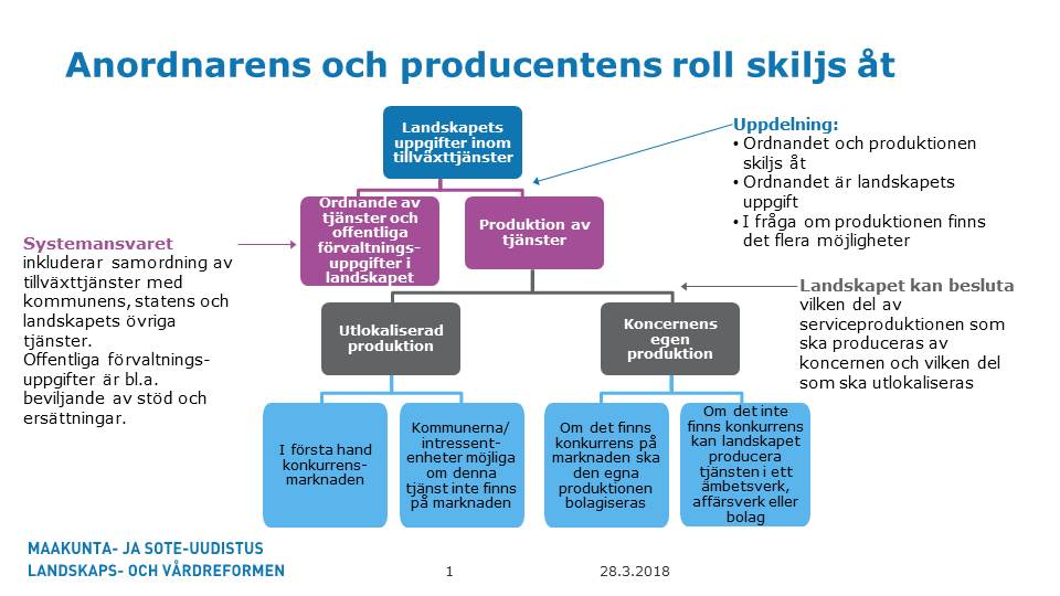 Av de tjänster inom regionförvaltningen som gäller främjande av ekonomisk tillväxt, syssel-sättningen, sysselsättandet och företagens verksamhetsförutsättningar och som inom arbets- och näringsministeriets förvaltningsområde överförs till landskapen byggs det upp tillväxt-tjänster i landskapen med hjälp av en modell med flera producenter som främjar kundens valfrihet och konkurrens mellan producenterna. Landskapet kan producera tillväxttjänsterna självt eller skaffa tjänsterna genom att konkurrensutsätta tjänsteproducenterna eller genom att godkänna alla tjänsteproducenter som uppfyller förutsättningarna och som förbinder sig att iaktta villkoren för tjänsteproduktionen. Kommunerna och kommunernas anknutna enheter ska inte kunna vara producenter av tjänster på landskapsnivå. I den nya modellen för ordnande av tjänster beaktas varje regions särdrag i fråga om tillväxt bättre än i det nuvarande systemet. Samtidigt ändras styrningen av tjänsterna inom arbets- och näringsministeriets förvaltningsområde från styrmodellen för statliga ämbetsverk till lagstiftningsstyrning av självstyrande landskap. I propositionen föreslås bestämmelser om en ny typ av interaktion mellan ministeriet och de självstyrande landskapen samt om övervakningen av ordnandet och produktionen av tillväxttjänster, vilken ska höra till Statens tillstånds- och tillsynsmyndighet från och med den 1 januari 2020.