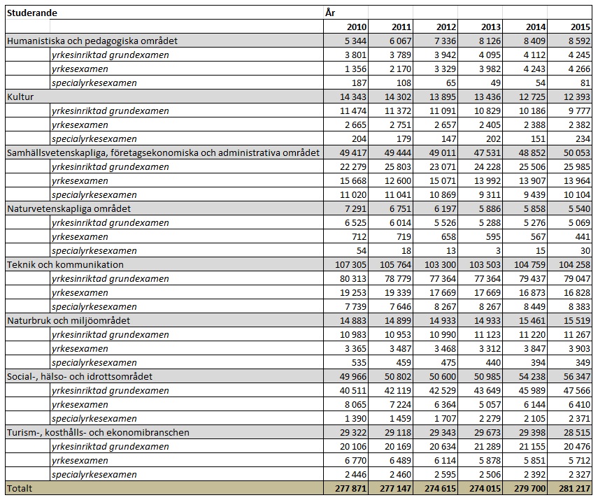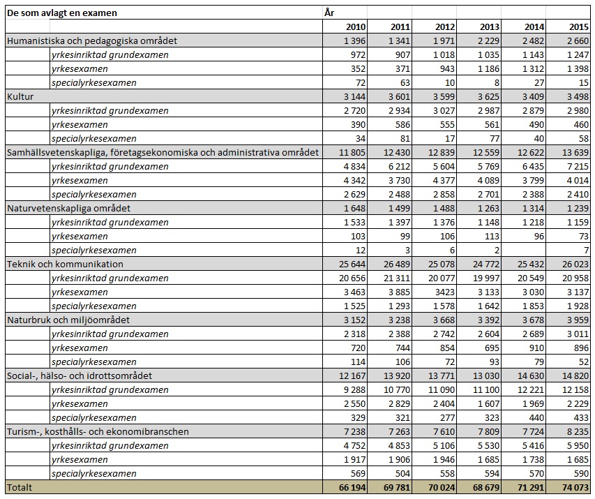 I de gemensamma examensdelarna ska fortfarande bland annat modersmål, det andra inhemska språket, främmande språk, kulturkännedom, matematik, fysisk, kemi, informations- och kommunikationsteknik, samhällskunskap och samhällsfärdigheter, arbetslivskunskap och arbetslivsfärdigheter, bevarande av arbetsförmågan och välbefinnande, idrott och hälsokunskap, företagsamhet, etik, psykologi, främjande av hållbar utveckling, konst, kultur och kreativ framställning ingå som delområden för att examensdelarna ska stärka yrkesbildningen och ge färdigheter för fortsatta studier och livslångt lärande. De gemensamma examensdelarna och deras delområden och mål för kunnandet läggs dock fast utifrån krav på kunnande. Starkare förankring i kunnande gör det lättare att identifiera i synnerhet informellt lärande och vardagskunskap. Dessutom blir det lättare att genomföra gemensamma examensdelar i samband med yrkesinriktade examensdelar. Det i sin tur hjälper de studerande att förstå vilken roll de gemensamma examensdelarna spelar i arbetslivet och motiverar dem att studera de delarna.