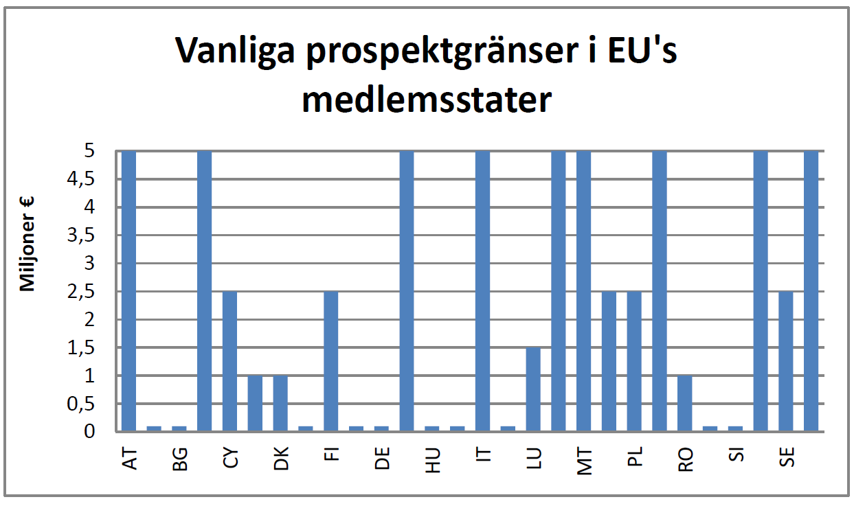I en europeisk jämförelse som Esma och kommissionen har gjort har det framgått att spridningen mellan olika EU-stater är stor. I Finland har ändringen av öppenhetsdirektivet genomförts genom en ändring av värdepappersmarknadslagen (RP 11/2015 rd) som trädde i kraft den 26 november 2015. Till följd av ändringen måste prospekt över värdepapper som erbjuds allmänheten upprättas först när det sammanlagda erbjudandet är minst 2,5 miljoner euro (tidigare 1,5 miljoner euro). Även det gränsvärdet är fortfarande strängare än genomsnittet, och därför föreslås det bli höjt till fem miljoner euro för mottagare av gräsrotsfinansiering, dvs. samma nivå som det allmänna gränsvärdet för prospekt i t.ex. Kroatien, Grekland, Irland, Italien, Litauen, Malta, Portugal, Spanien, Storbritannien och Österrike. I Nederländerna, Sverige, Polen och Cypern är gränsvärdet för prospekt för närvarande 2,5 miljoner euro, så genom åtgärden kan den konkurrenskraft som den finländska marknaden för gräsrotsfinansiering har förbättras i förhållande till de viktigaste konkurrentländerna. Inget prospekt behöver således offentliggöras, om värdepapper under en tolvmånadersperiod erbjuds i Finland för ett sammanlagt värde på mindre än fem miljoner euro, räknat från det första värdepapperserbjudandet. Genom ändringen strävar man efter att göra det lättare särskilt för tillväxtföretag och små och medelstora företag att få finansiering och att minska de administrativa kostnaderna för värdepapperserbjudanden till små belopp. Dessa kostnader beror bl.a. på att experter måste avlönas för processen med att upprätta prospekt. Med prospektundantaget för gräsrotsfinansiering försöker man stödja branschens tillväxt i Finland och få små och medelstora företag som söker finansiering med i gräsrotsfinansieringen. Motsvarande avgöranden som uttryckligen gäller gräsrotsfinansiering och prospektgränsvärden som stödjer branschens tillväxt har träffats också i Frankrike, Tyskland, Belgien och Österrike. Med lagstadgade spelregler som sporrar till att utnyttja gräsrotsfinansiering, t.ex. ett högre gränsvärde på fem miljoner euro för prospekt när det gäller gräsrotsfinansiering, kan man stödja företagens tillväxt och möjligheter att få alternativ finansiering också från en större grupp investerare. Genom en sådan lösning avviker man från det krav på opartiskhet som normalt tillämpas på finansmarknaden, vilket med beaktande av att branschen är liten och outvecklad dock kan anses motiverat. Vid erbjudande av sådana värdepapper enligt värdepappersmarknadslagen för vilka prospekt inte behöver upprättas ska man dock tillämpa bestämmelserna i 1 kap. 2—4 § i värdepappersmarknadslagen om iakttagande av god värdepappersmarknadssed, förbud mot att lämna osann eller vilseledande information och tillhandahållande av tillräcklig information för investerarna. Dessa bestämmelser utgör en garanti för ett tillräckligt gott investerarskydd vid små värdepapperserbjudanden. Informationsskyldigheten preciseras genom en förordning av finansministeriet som utfärdas med stöd av 21 § och som är avsedd att innehålla bestämmelser bl.a. om riskvarning och annat som bedöms vara viktigt från investerarnas synpunkt.