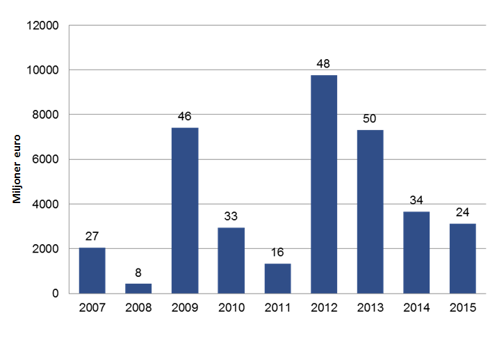 Enligt statistikuppgifter från Finlands Bank har det totala eurobeloppet för obligationslån emitterade av finländska företag under de senaste åren varierat mellan dryga 400 miljoner år 2008 till cirka 10 miljarder år 2012. På samma gång har antalet emissioner på årsnivå varierat från under tio till nästan femtio emissioner. År 2015 finansierade företagssektorn sin verksamhet med en upptagning av obligationslån på totalt cirka 3,1 miljarder euro, vilket är drygt en halv miljard mindre än föregående år (figur 1).