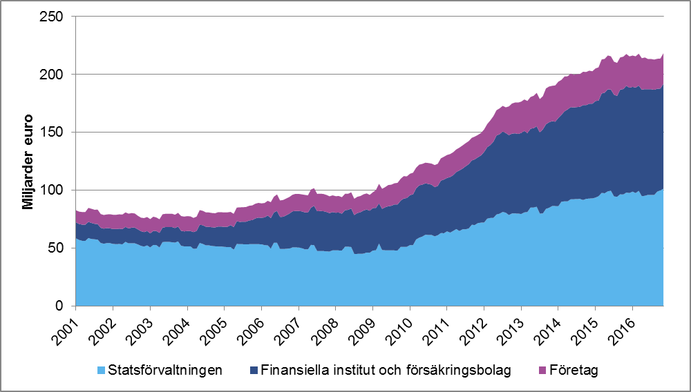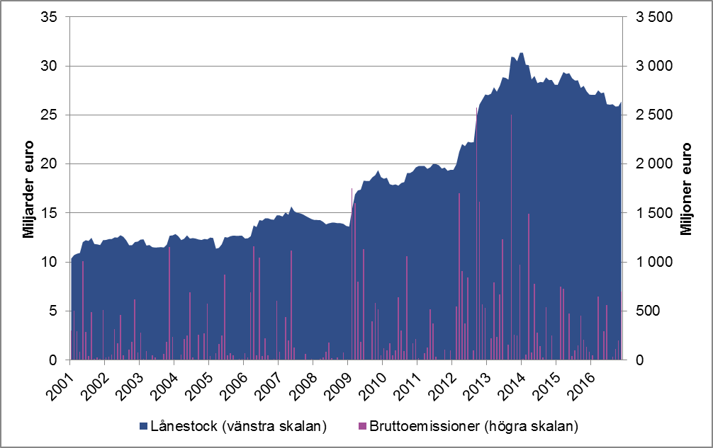 Obligationslån är skuldinstrument vars maturitet vanligen växlar mellan ett år och flera decennier. Enligt 34 § 1 mom. i lagen om skuldebrev kan obligationer (i 34 § 1 mom. används på svenska termen masskuldebrev) emitteras av offentliga samfund och av bokföringsskyldiga. Staten, finansiella institut och stora företag hör till de viktigaste emittenterna av obligationslån. Det totala nominella värdet på långa obligationslån som emitterats av inhemska aktörer har mer än fördubblats sedan 2001, då obligationslånens sammanlagda värde var knappa 80 miljarder euro, medan det nominella värdet 2016 var t.o.m. över 218 miljarder euro (figur 3). Det nominella värdet för obligationslån emitterade i Finland var vid utgången av året 100 miljarder euro. Som jämförelse kan nämnas att marknadsvärdet för Helsingforsbörsen var 209 miljarder euro vid utgången av 2016.