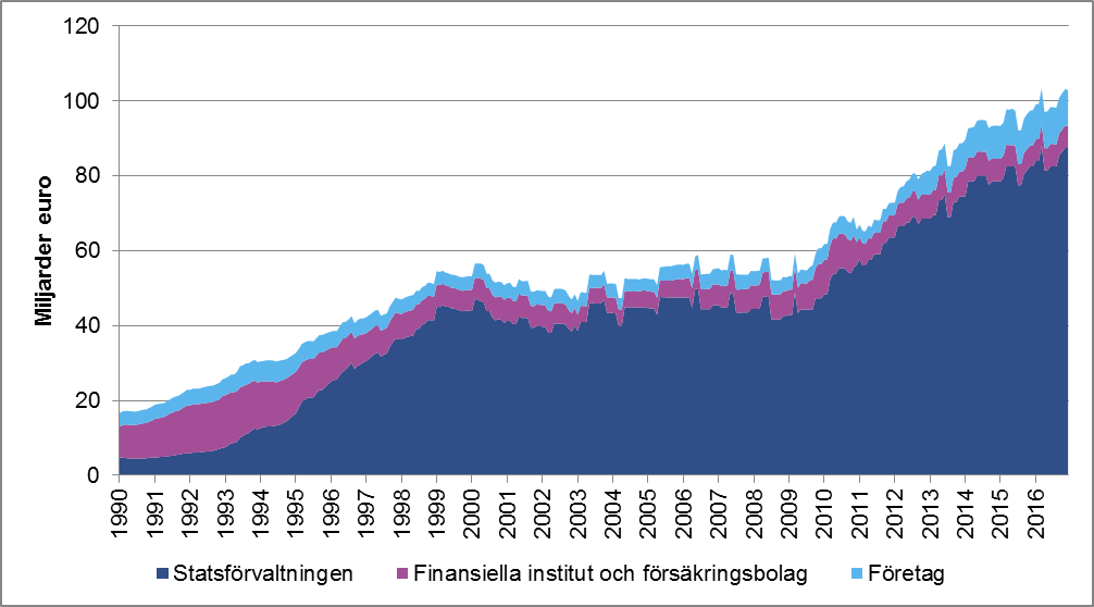 Figur 4 Också obligationslån emitterade här i landet har ökat (det nominella värdet på obligationsstocken år 1990—2016)