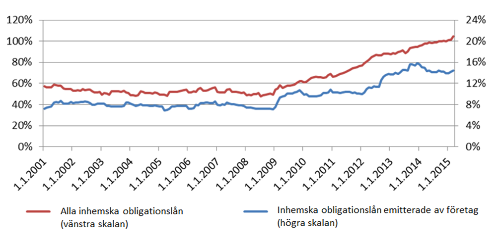 Vid ingången av 2015 hade knappa 70 inhemska företag emitterat obligationslån, jämfört med att knappa 80 inhemska företag under de senaste fem åren hade emitterat obligationslån. I praktiken är det endast stora företag som kan skaffa finansiering med hjälp av/genom obligationslån, eftersom en offentlig emission måste vara omfattande för att likviditeten ska bevaras. Detta utesluter finansiering genom obligationslån för många företag. Det sammanlagda värdet av alla obligationslån emitterade av inhemska företag, inklusive obligationslån emitterade i utlandet, varierade under de senaste fem åren från knappt 20 miljarder euro till nästan 30 miljarder euro (figur 5). Under de senaste fem åren har värdet på obligationslånen varierat mellan 17 och 32 miljarder euro. År 2012 och 2013 har användningen av obligationslån vid finansieringen av företag ökat. Företagens obligationslånestock var som störst i januari 2014.