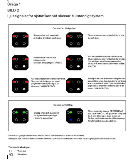 I 56 § i sjötrafiklagen finns bestämmelser om placering och utformning av sjötrafikmärken. Enligt 4 mom. i den paragrafen har Transport- och kommunikationsverket rätt att meddela närmare föreskrifter om sjötrafikmärkens och ljussignalers placering, färger, konstruktion och dimensionering, men verket har inte behörighet att meddela föreskrifter om de ljussignalkombinationer som ska användas. För närvarande används många slags ljussignalkombinationer. Detta kan leda till att ljussignaler tolkas fel och äventyra trafiksäkerheten.