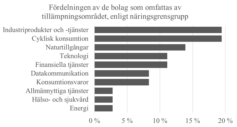 Börsbolagen följer de rekommendationer som ingår i koden för bolagsstyrning med stöd av principen ”följ eller förklara” (eng. comply or explain). Om ett bolag avviker från en rekommendation som ingår i koden ska bolaget offentliggöra orsaken till beslutet att avvika från rekommendationens innehållskrav eller beslutet att inte följa rekommendationen. Våren 2024 var könsfördelningen i styrelserna i de bolag som omfattas av tillämpningsområdet den att 36 procent av styrelseledamöterna var kvinnor. Finländska börsbolag avviker ytterst sällan från rekommendationerna i koden för bolagsstyrning. Endast ett fåtal mindre börsbolag meddelade 2022 att de avviker från de rekommendationer om mångfald som ingår i koden för bolagsstyrning. Tillämpningen av direktivet ställer således i praktiken till största delen inte sådana krav som i nuläget inte kunde förväntas av ett bolag. Det bör dock noteras att rekommendationerna som sådana inte är förpliktande för bolagen på lagnivå, så det är möjligt att bristfällig praxis i vissa bolag främjar till exempel valet av styrelsekandidater med likartad profil.