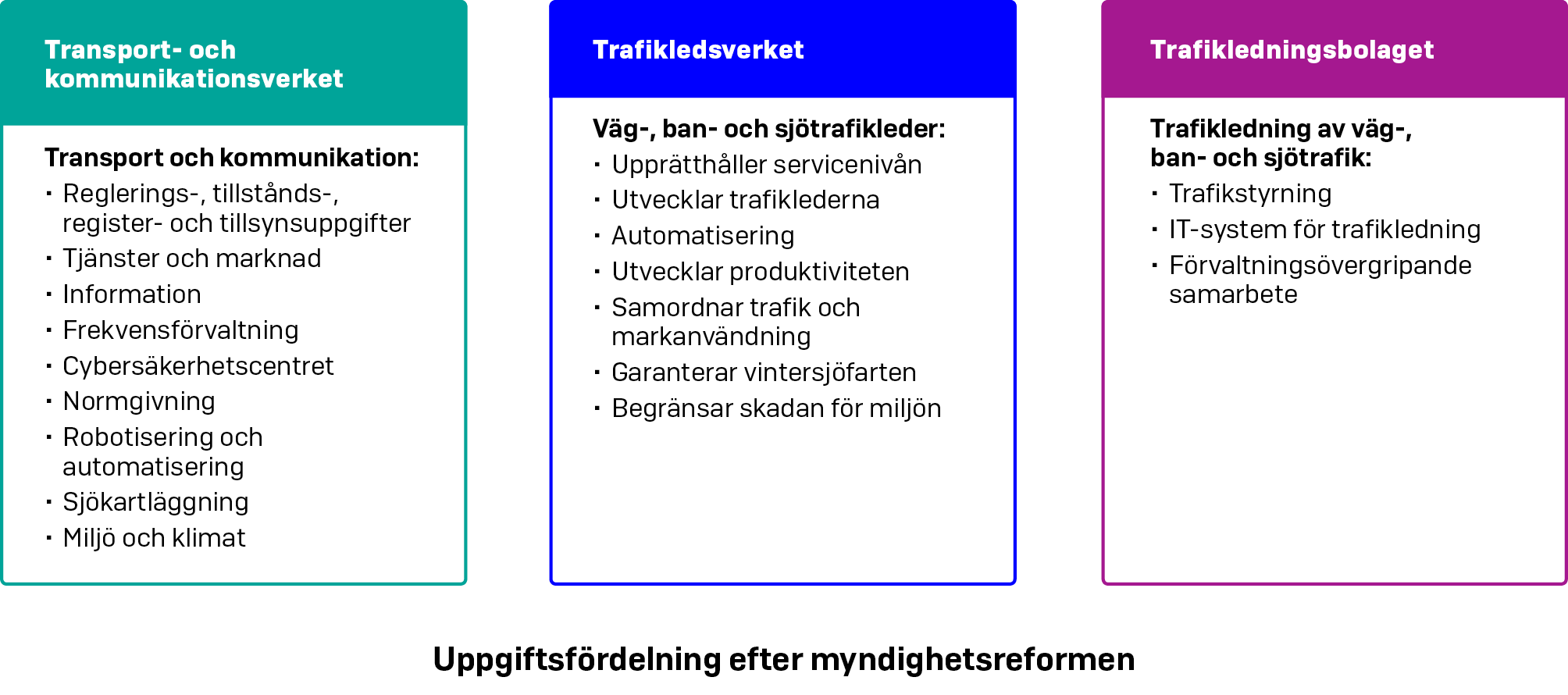 Uppgiftsfördelningen i anslutning till ITS-direktivet (Europaparlamentets och rådets direktiv 2010/40/EU om ett ramverk för införande av intelligenta transportsystem på vägtransportområdet och för gränssnitt mot andra transportslag) inom kommunikationsministeriets förvaltningsområde förtydligas så att Transport- och kommunikationsverket svarar för utvecklingsarbetet som gäller intelligenta transporter på riksomfattande och strategisk nivå och för internationell påverkan och intressebevakning i anslutning därtill. Trafikledsverkets uppgift ska vara att utveckla trafikledsnätets fysiska och digitala infrastruktur och att främja automatiseringen av transporterna i egenskap av innehavare av trafikledsnätet.