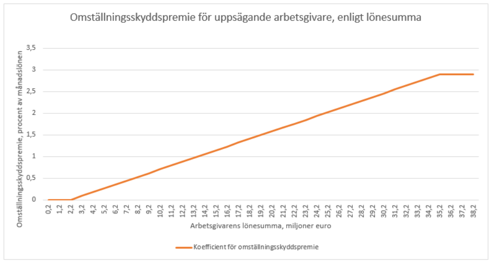 En i 12 § avsedd arbetsgivare vars lönesumma som utgör grund för arbetslöshetsförsäkringspremien under det år som föregår uppsägningsåret samt statens bokföringsenhet eller affärsverk vars motsvarande lönesumma är minst 2 197 500 euro är skyldiga att betala uppsägande arbetsgivares omställningsskyddspremie. Full uppsägande arbetsgivares omställningsskyddspremie tas ut om arbetsgivarens lönesumma är minst 35 160 000 euro. Om lönesumman är mindre, sjunker premien lineärt så att ingen premie tas ut om lönesumman är högst 2 197 500 euro.