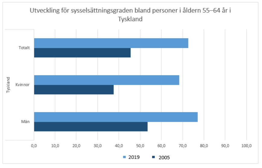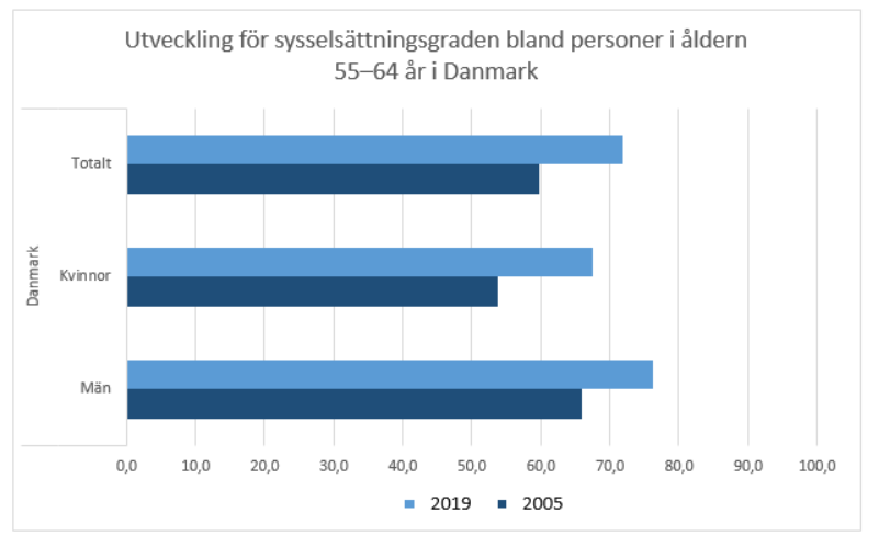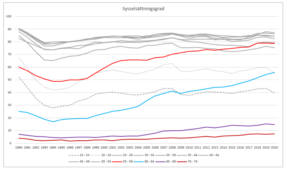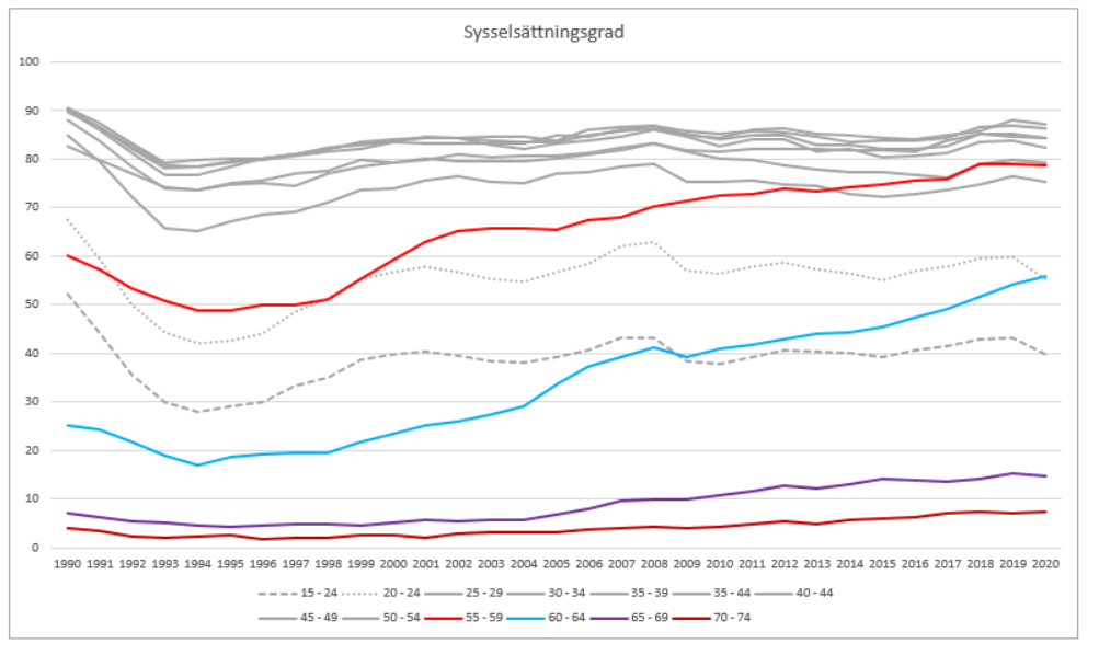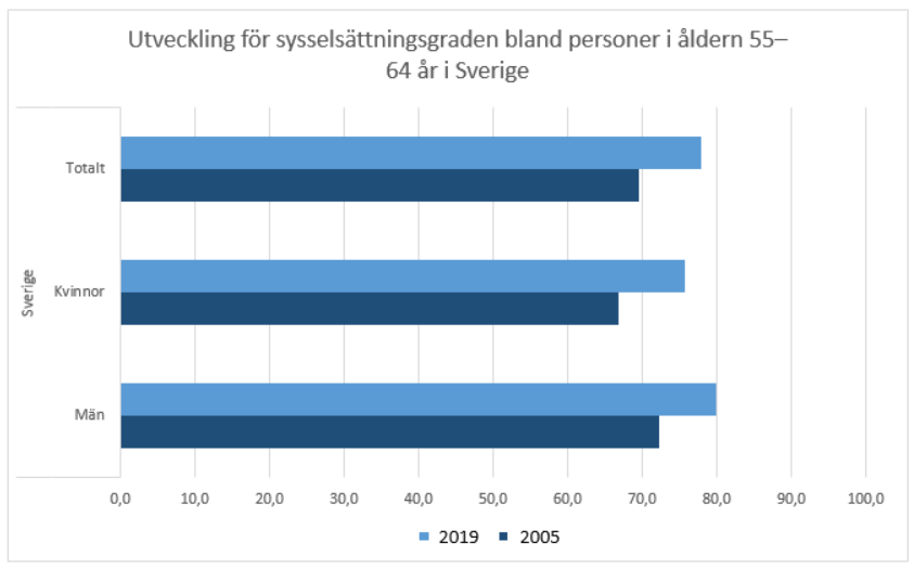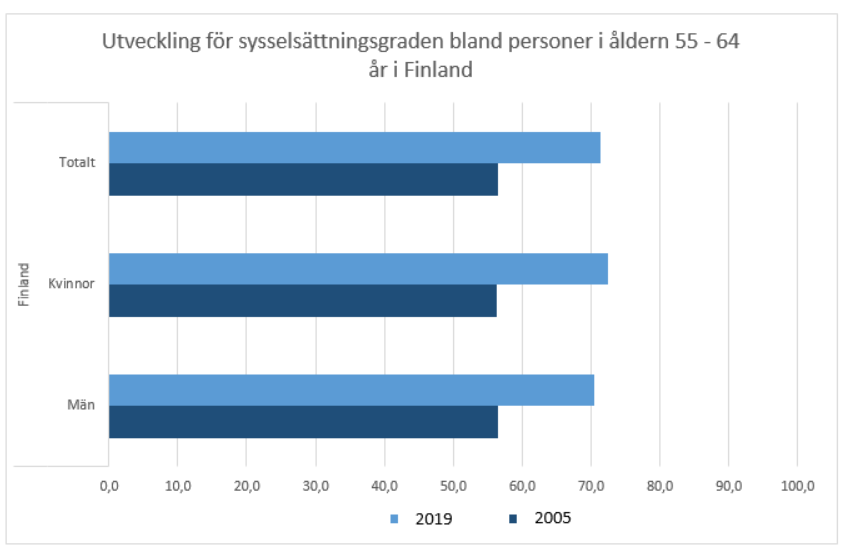 Andelen äldre som stannar kvar i arbete och sysselsättningen bland äldre har ökat under hela 2000-talet. Så sent som på 1990-talet var sysselsättningsgraden för äldre mycket låg, i synnerhet bland personer i åldern 60—64 men även bland dem som var 55—59 år gamla. Därefter har sysselsättningen förbättrats år för år. Den förbättrade sysselsättningen syns som en bättre inkomstutveckling för de nämnda åldersklasserna i jämförelse med andra åldersklasser. Den positiva inkomstutvecklingen baserar sig på att andelen personer med löneinkomster ökar. Slutrapport av den arbetsgrupp som bereder metoder för främjandet av sysselsättningen bland äldre, 11.3.2019. Tillgänglig på finska på adressen https://api.hankeikkuna.fi/asiakirjat/d2b523c5-77e2-4709-b404-b330f71deab2/f9e4ed0a-6852-4f08-8e43-0e46ec6b50cc/JULKAISU_20190311125000.PDF