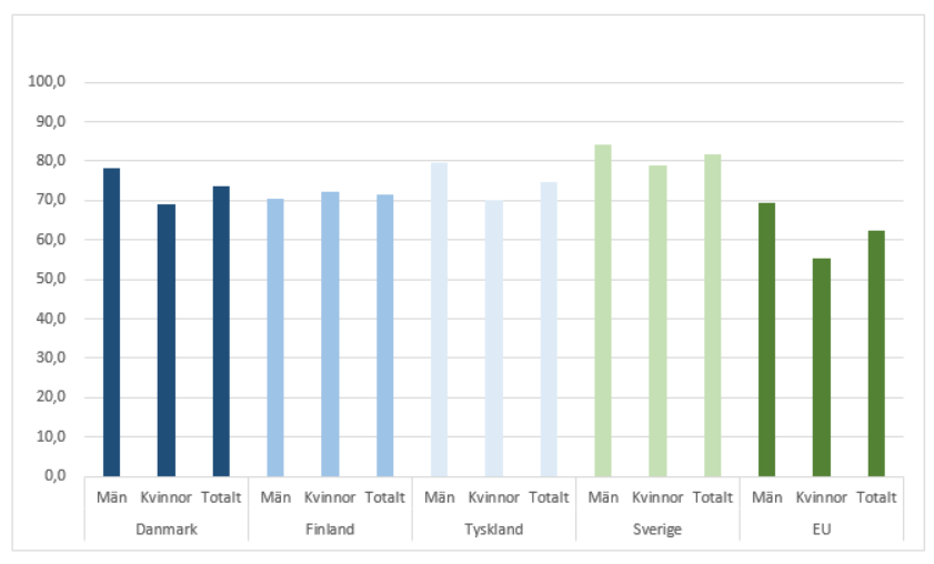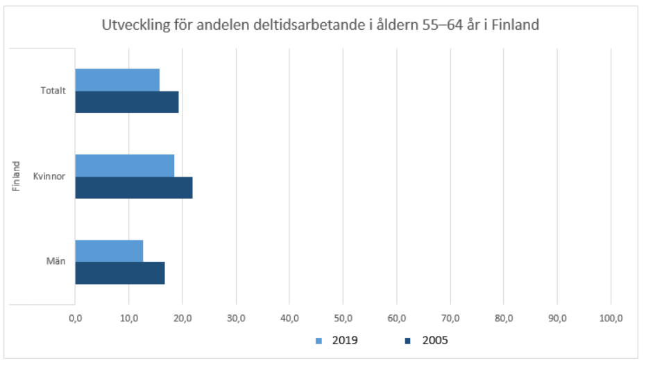 Trots den positiva sysselsättningsutvecklingen är sysselsättningsgraden för äldre i Finland betydligt lägre än i de nordiska jämförelseländerna. Den höga sysselsättningsgraden i de övriga nordiska länderna förklaras delvis av att andelen deltidsarbete är större. Den arbetsgrupp som bereder metoder för främjandet av sysselsättningen bland äldre var fullständigt enig om att arbetskraftspotentialen bland äldre skulle kunna utnyttjas bättre och att det är viktigt att förbättra sysselsättningsutvecklingen för denna grupp genom olika åtgärder. ibid.