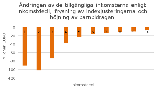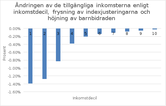 Förslaget om att låta bli att göra indexjusteringar gäller sådana barn och barnfamiljer där föräldrarna får förmåner som omfattas av propositionen. Propositionen har således konsekvenser också för barnens försörjning. Den sänkning av den reella nivån på primära förmåner som orsakas av uteblivna indexjusteringar kompenseras delvis av de föreslagna höjningarna av barnbidraget. Alla barnfamiljer får emellertid inte höjningar av barnbidraget och behovet av utkomststöd kan öka i vissa familjer. Trots ändringen som gäller frysning av indexjusteringar omfattas barn fortfarande av de förmåner och tjänster som avses i 19 § 2 och 3 mom. i grundlagen. Det bör dessutom konstateras att på grund av barnbidragets universella karaktär omfattar höjningen alla barnfamiljer på lika villkor, också de som inte berörs av uteblivna indexjusteringar. När det gäller barn i dessa familjer förbättrar höjningen av barnbidraget utkomsten och den ekonomiska ställningen.