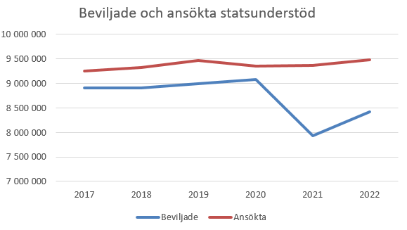 Figur 2. Jämförelse av ansökta och beviljade statsunderstödsbelopp (allmänt understöd) under olika år. Källa: Transport- och kommunikationsverket Traficom.