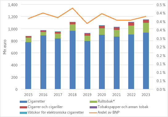 Cigaretter utgjorde 2023 den klart största delen av skattebasen för tobaksprodukter, mätt i mängden tobaksprodukter cirka två tredjedelar. Rulltobakens andel är knappt en femtedel och andelen cigarrer och cigariller en dryg tiondel.