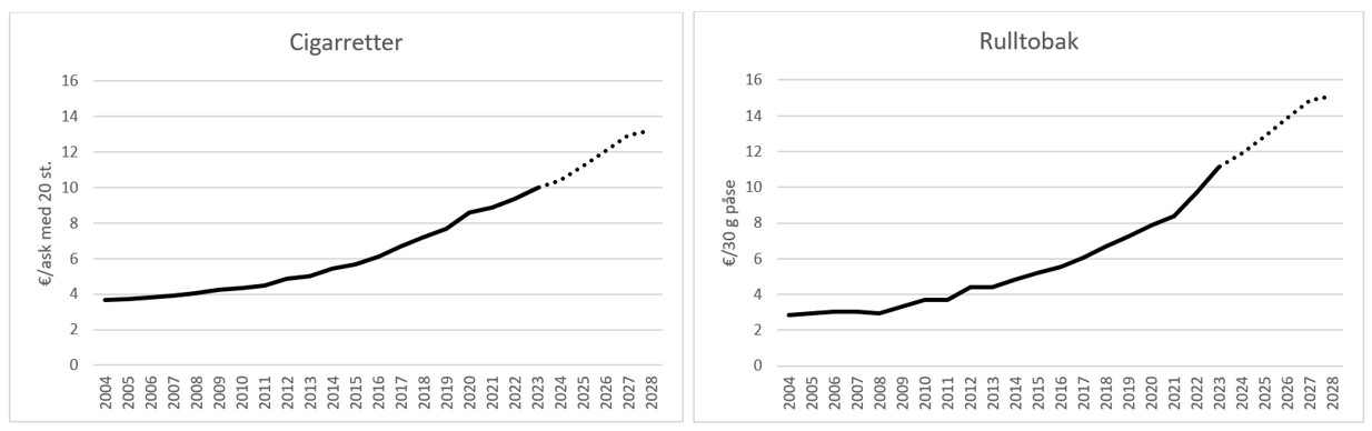 Genom flera skattehöjningar som genomförts från och med ingången av 2009 har en måttlig och stegvis prisstegring på tobaksprodukter eftersträvats. Skattehöjningarnas sammanlagda inverkan på priserna har ändå varit stor, vilket beror på att punktskattens andel av priserna på tobaksprodukter är betydande. Priset på cigaretter består i genomsnitt av cirka 90 procent skatt när mervärdesskatten beaktas. Efter att den senaste skattehöjningen som trädde i kraft den 1 juli 2023 överfördes till priserna, har det genomsnittliga priset på ett paket med 20 cigaretter stigit till över 10,20 euro efter att ha varit något på fyra euro år 2008.